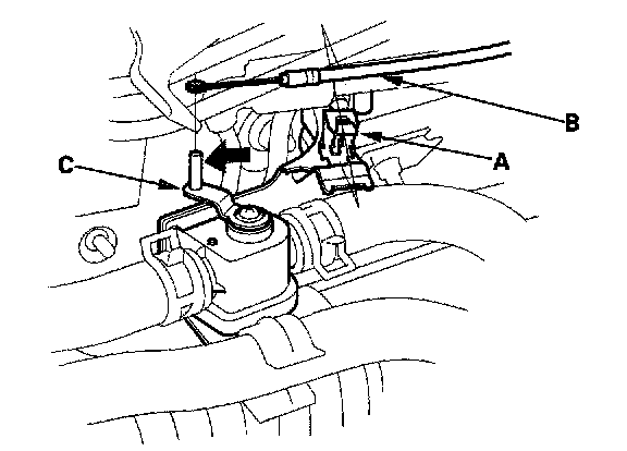 4. From under the hood, open the cable clamp (A), then disconnect the heater valve cable (B) from the heater valve arm (C). Turn the heater valve arm to the fully opened position as shown.