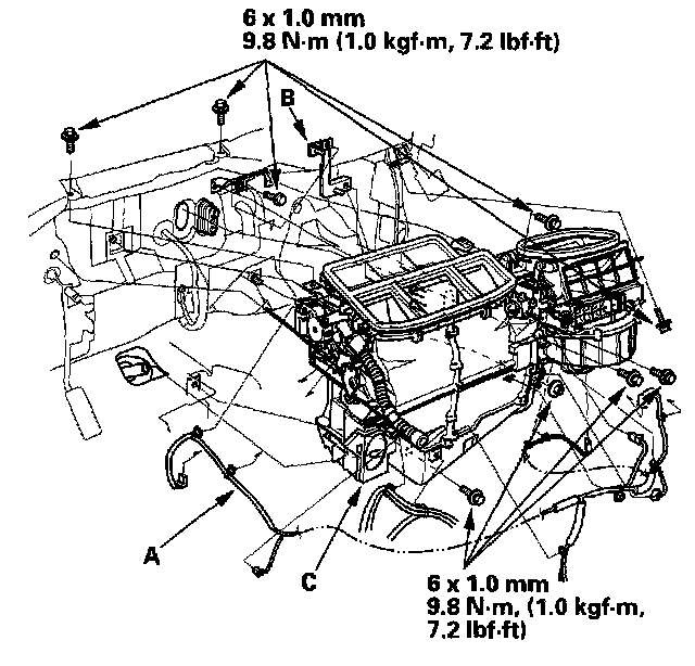 11. Remove the wire harness (A), the mounting bolts, the mounting nuts, the bracket (B), and the heater unit (C).