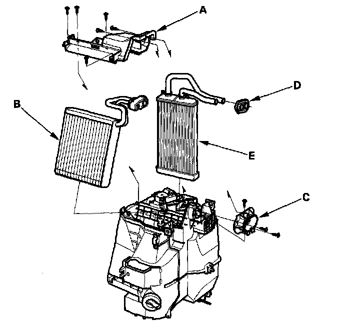 12. Remove the self-tapping screws and the expansion valve cover (A). Carefully pull out the evaporator core (B) so you don't bend the inlet and outlet pipes. Remove the self-tapping screws and the flange cover (C), then remove the grommet (D), and carefully pull out the heater core (E) so you don't bend the inlet and outlet pipes.