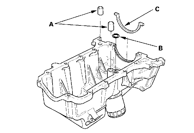 3. Install the dowel pins (A), and install the new O-ring (B) and oil pan gasket (C) on the oil pan.