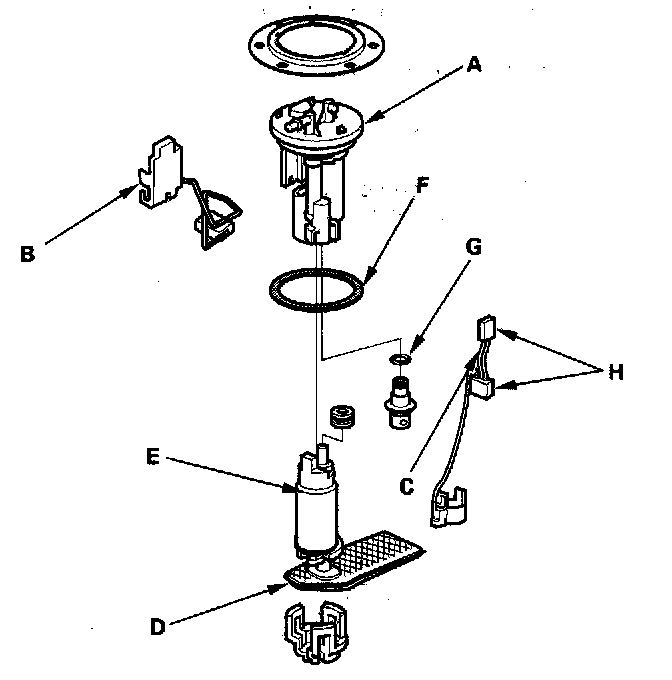9. Remove the stopper (B). Release the hook (C) and remove the fuel filter (D), the fuel gauge sending unit (E), the case (F), the wire harness (G), and the fuel pressure regulator (H).