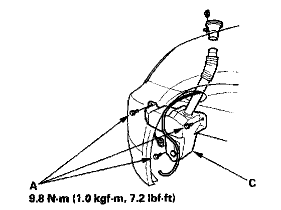 3. Remove the three bolts (A) and washer reservoir (C).
