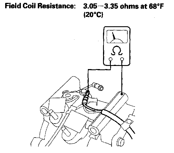 5. Release the field coil connector from the holder, then disconnect it. Check resistance of the field coil. If resistance is not within specifications, replace the field coil.