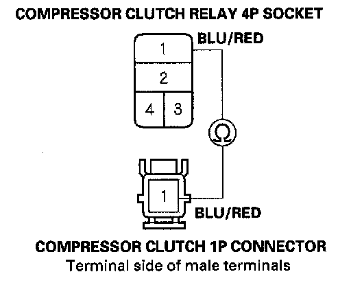 16. Check for continuity between the No.1 terminal of the compressor clutch relay 4P socket and the No.1 terminal of the compressor clutch 1P connector.