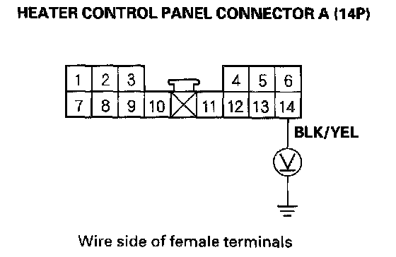 4. Measure the voltage between the No.14 terminal of heater control panel connector A (14P) and body ground.