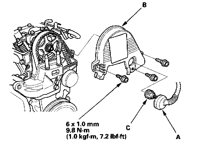 2. Remove the grommet (A) from the upper cover (B), and disconnect the CMP (TDC) sensor connector (C).