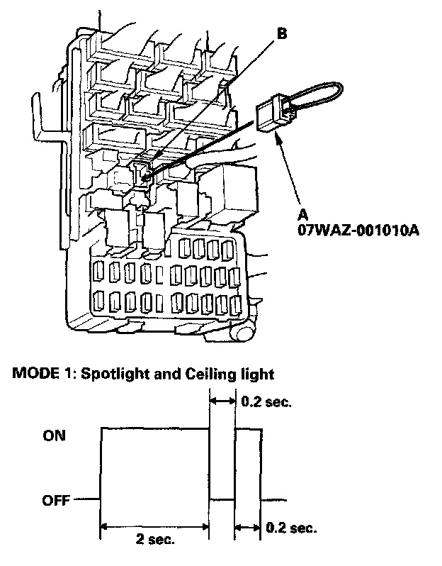 8. If the DTCs are present, the spotlight and ceiling light will blink to indicate the DTC(s). If more than one DTC is present, the DTCs will be displayed in ascending order. If there are no DTCs, the spotlight and ceiling light will not blink again after the Mode 1 indication.