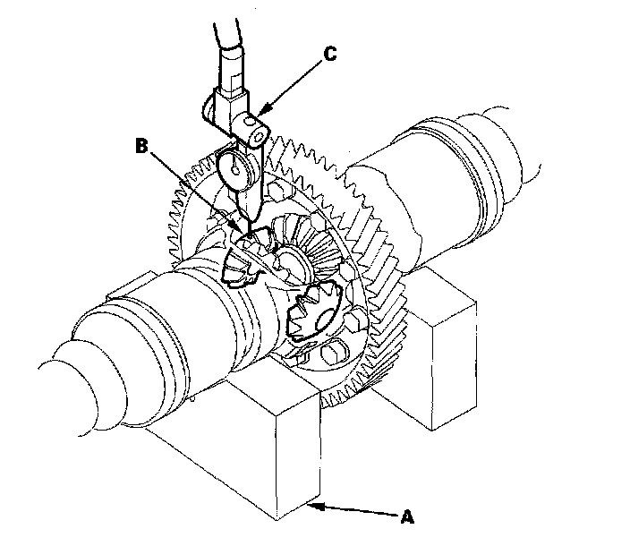 2. Check the backlash of the pinion gears (B) with a dial indicator (C).