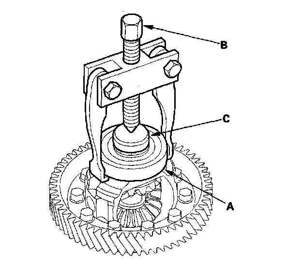 1. Remove the bearings (A) with a commercially available bearing puller (B), and adapter (C).