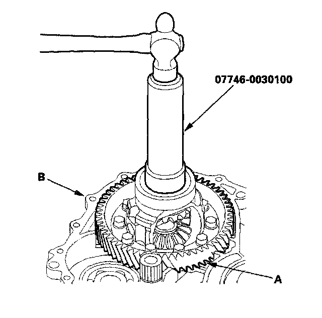 2. Install the differential assembly (A) in the transmission housing (B) using the special tool.