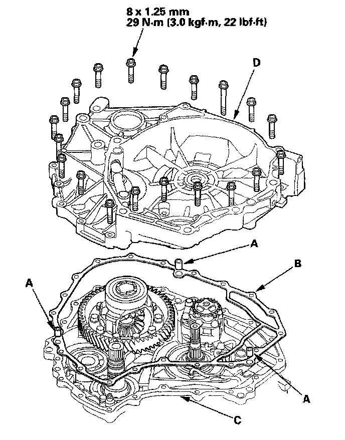4. Place the flywheel housing (D) on the transmission housing.