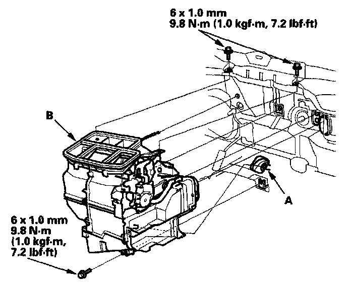 Heater Unit/Core ReplacementSRS components are located in this area. Review the SRS component locations, and precautions and procedures in the SRS section before performing repairs or service.