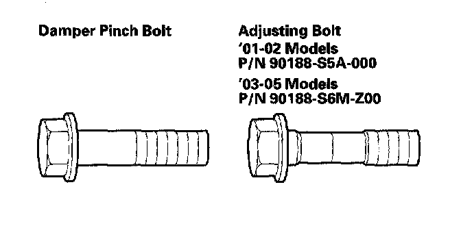 The front camber can be adjusted by exchanging one or both of the damper pinch bolts with the smaller diameter adjusting bolt(s). The difference between the adjusting bolt diameter and the pinch bolt hole diameter allows a small range of adjustment.
