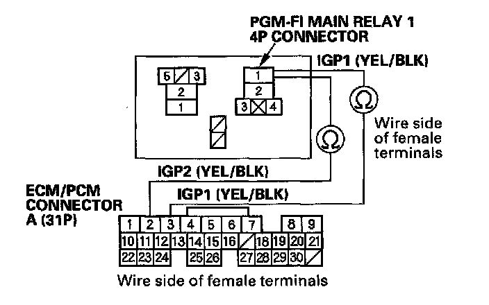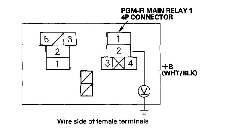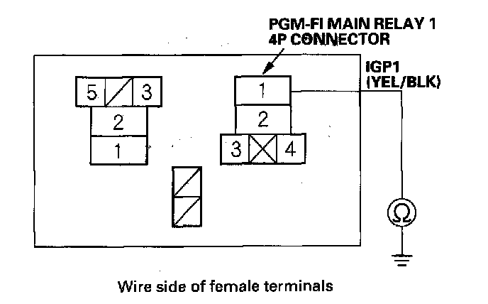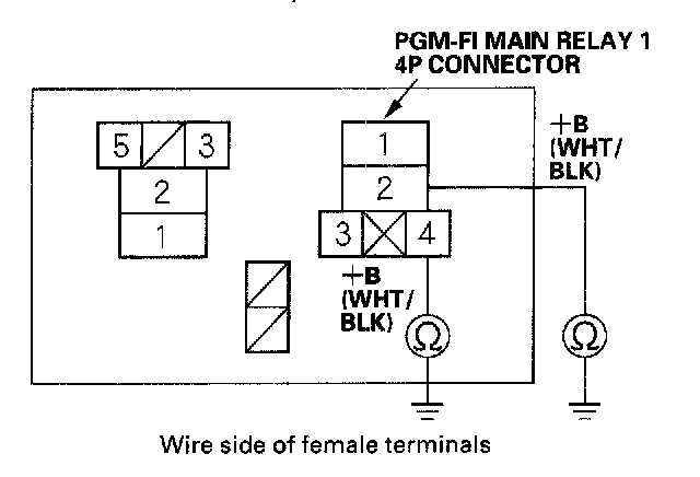 18. Check for continuity between body ground and PGM-FI main relay 1 4P connector terminals No.2 and No.4 individually.