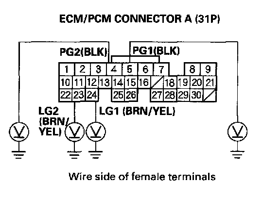 51. Measure voltage between body ground and ECM/PCM connector terminals A4, A5, A23, and A24 individually.