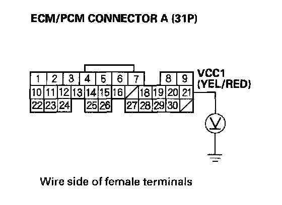 52. Measure voltage between body ground and ECM/PCM connector terminal A21.