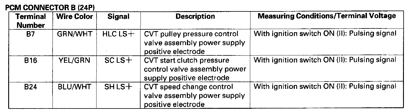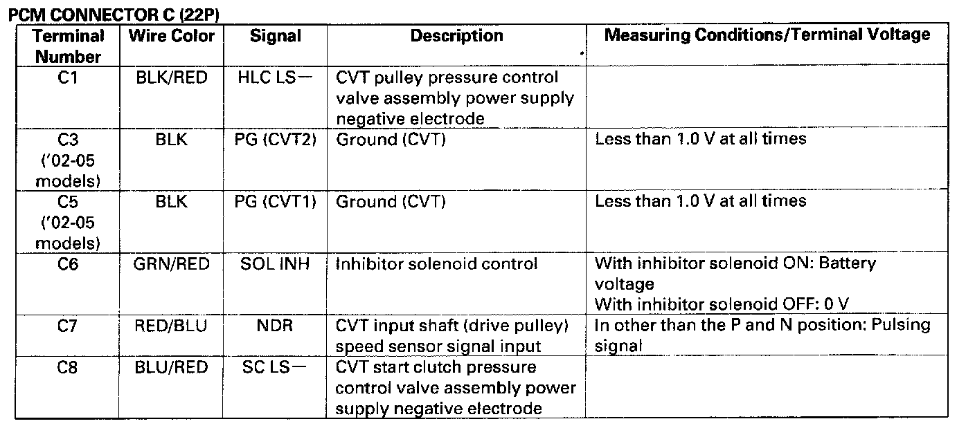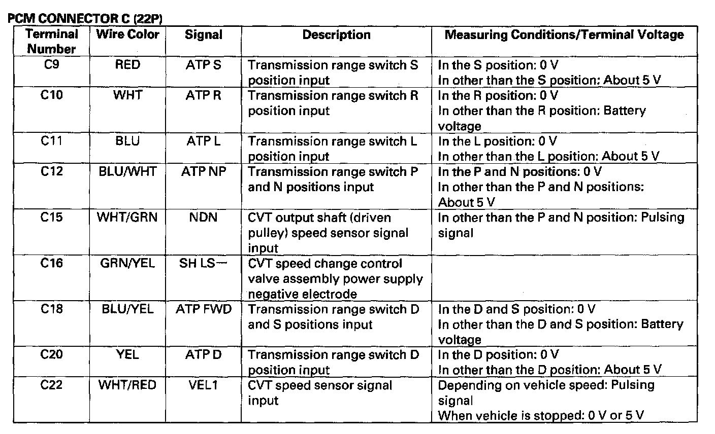 PCM Inputs and OutputsThe PCM terminal voltage and measuring conditions are shown for the connector terminals that are related to the A/T control system. The other PCM terminal voltage and measuring conditions are described in section 11.