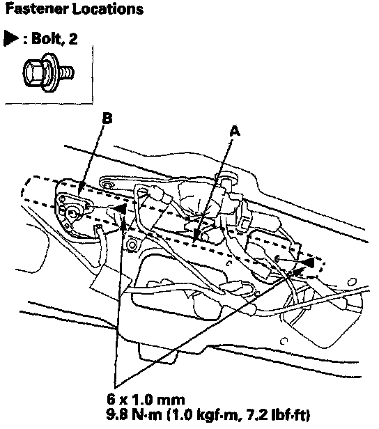 2. From inside the hatch, remove the bolts securing the rear license trim (A) and hatch lock cylinder (B).