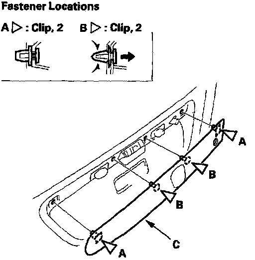 3. From inside the hatch, release the clips (A, B) while holding the rear license trim (C), then remove the trim. Take care not to scratch the hatch.