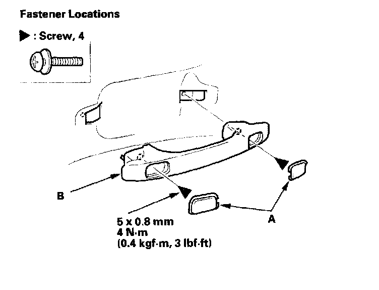 3. Remove the caps (A) from both rear passenger grab handles (B). Remove the screws, and then remove the handles.