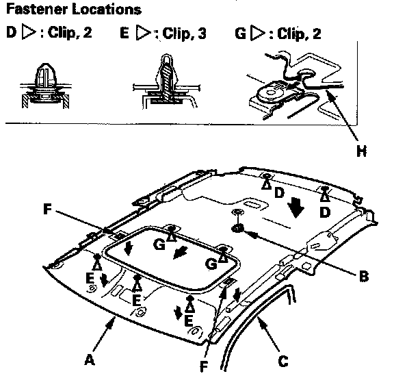 5. With the help of an assistant, release the clips (G) of the headliner from the moonroof frame (H) by sliding the head liner forward,and lowering it.
