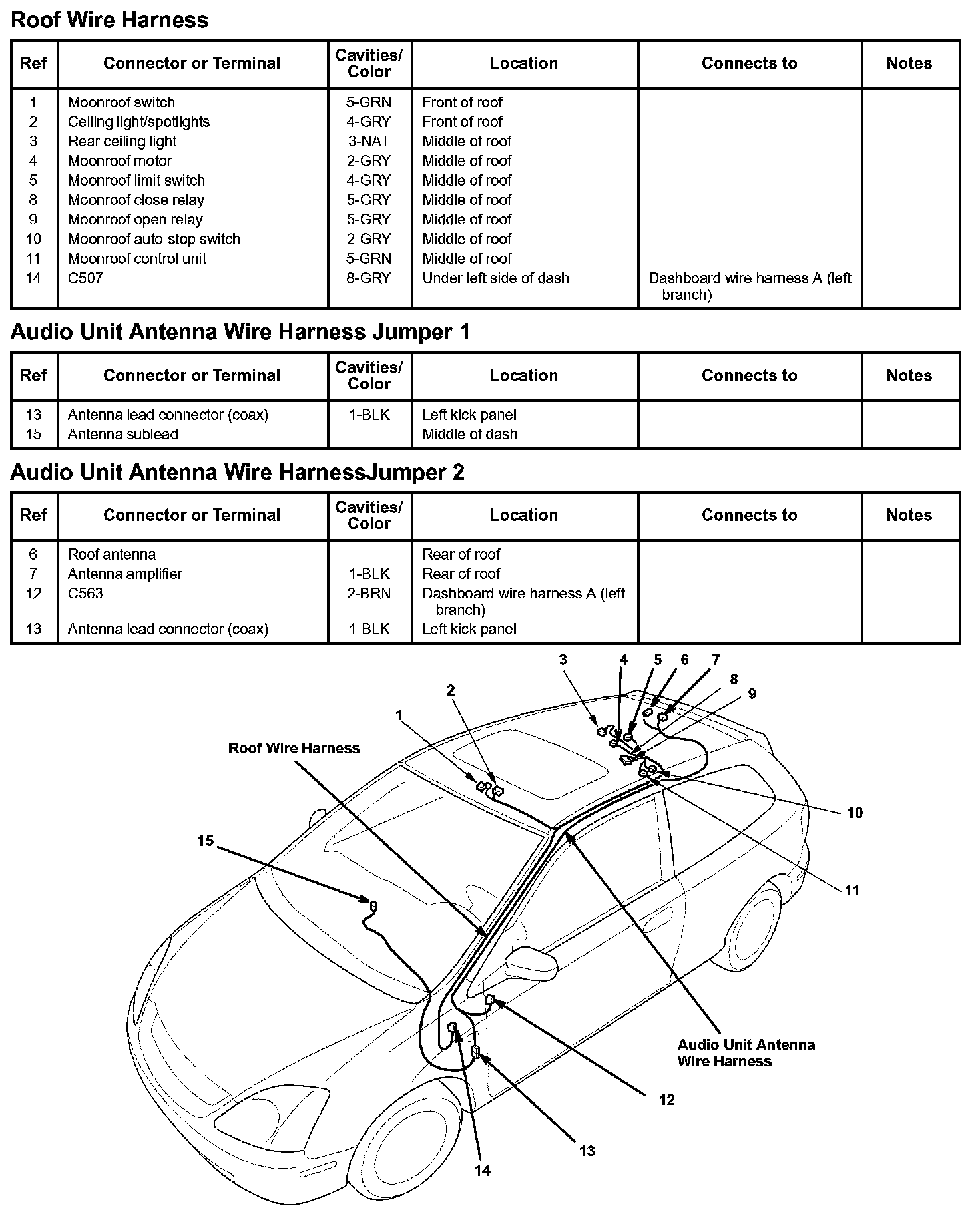Roof Wire Harness/Audio Unit Antenna Wire Harness Jumper 1/Audio Unit Antenna Wire Harness Jumper 2: