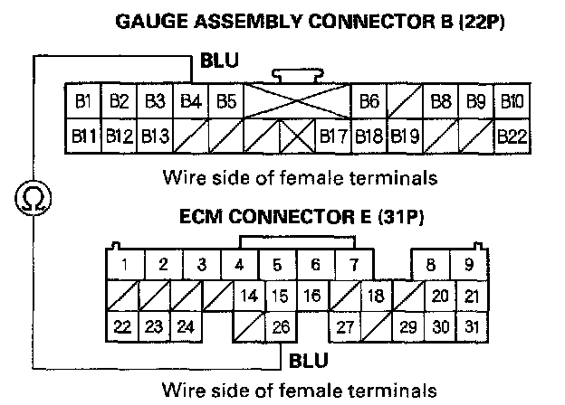 5. Check for continuity between the gauge assembly connector B (22P) No. 4 terminal and ECM connector E (31P) No. 26 terminal.