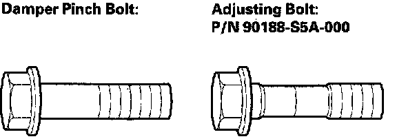 NOTE: The camber angle can be adjusted up to ± 15' (center of tolerance) by replacing one damper pinch bolt with the adjusting bolt. The camber angle can be adjusted up to ± 30' by replacing both upper and lower damper pinch bolts with the adjusting bolts.