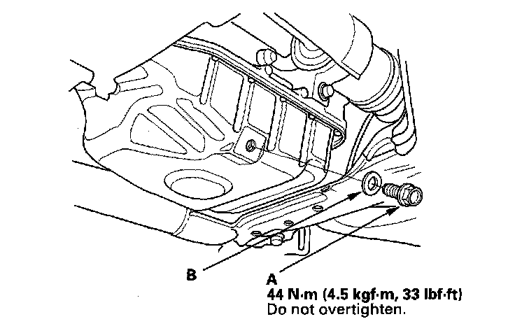 3. Reinstall the drain bolt with a new washer (B).