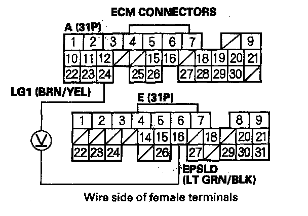 5. Measure voltage between ECM connector terminals A24 and E16.