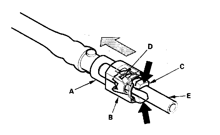 10. Disconnect the quick-connect fitting (A): Hold the connector (B) with one hand, and squeeze the retainer tabs (C) with the other hand to release them from the locking tabs (D). Pull the connector off.