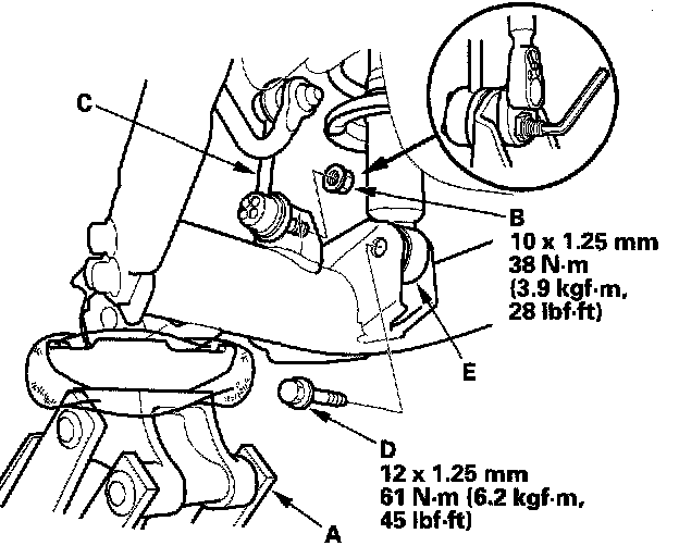 5. Remove the flange bolt (D), and disconnect the damper (E) from the trailing arm.