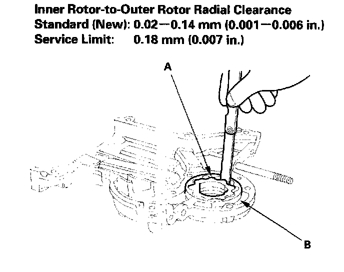 3. Check the inner-to-outer rotor radial clearance between the inner rotor (A) and outer rotor (B). If the inner-to-outer rotor radial clearance exceeds the service limit, replace the oil pump.