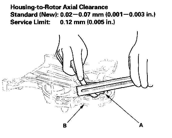 4. Check the housing-to-rotor axial clearance between the rotor (A) and pump housing (B). If the housing to-rotor axial clearance exceeds the service limit, replace the oil pump.