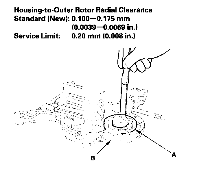 5. Check the housing-to-outer rotor radial clearance between the outer rotor (A) and pump housing (B). If the housing-to-outer rotor radial clearance exceeds the service limit, replace the oil pump.