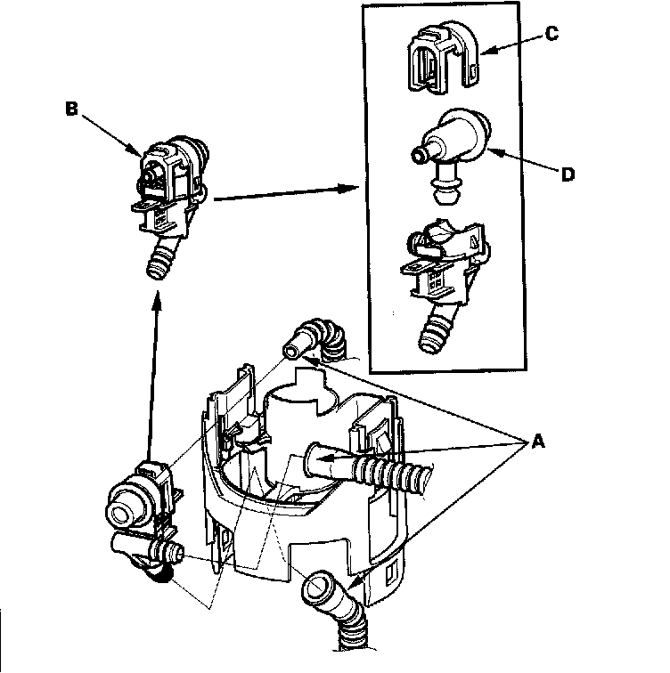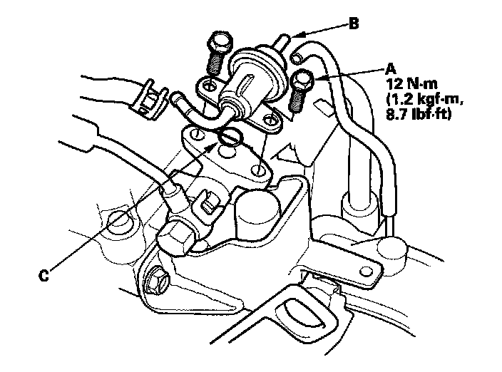 3. Remove the pressure regulator bracket (C) and the fuel pressure regulator (D).