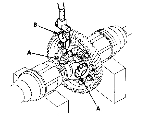 2. Check the backlash of the pinion gears (A) with a dial indicator (B).