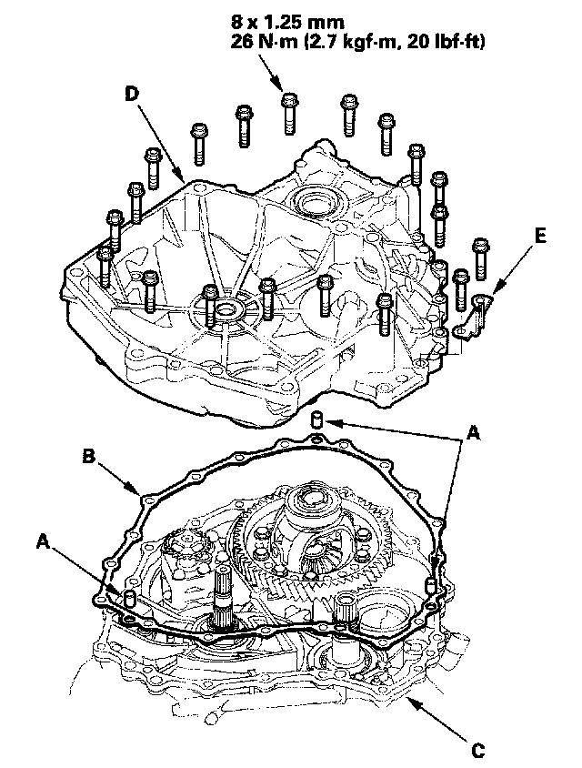4. Install the housing bolts with the harness clamp bracket (E), and tighten the bolts in two or more steps in a crisscross pattern.