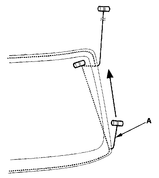 7. With a helper on the outside, pull the piano wire (A) back and forth in a sawing motion. Hold the piano wire as close to the glass as possible to prevent damage to the body and related parts. Carefully cut through the rubber dam and adhesive around the entire glass.
