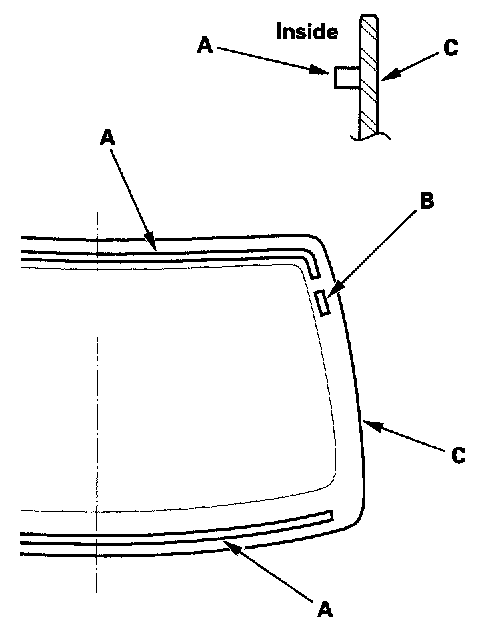 12. Attach any rubber dams (A), fasteners (B), etc to the inside face of the glass (C). Be careful not to touch the glass where adhesive will be applied.