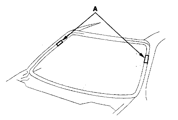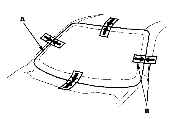 15. If new glass will be installed, set the glass (A) in the opening, and center it. Make alignment marks (B) across the glass and body with a grease pencil. If the glass has alignment clips, alignment marks are not needed. Be careful not to touch the glass where adhesive will be applied.