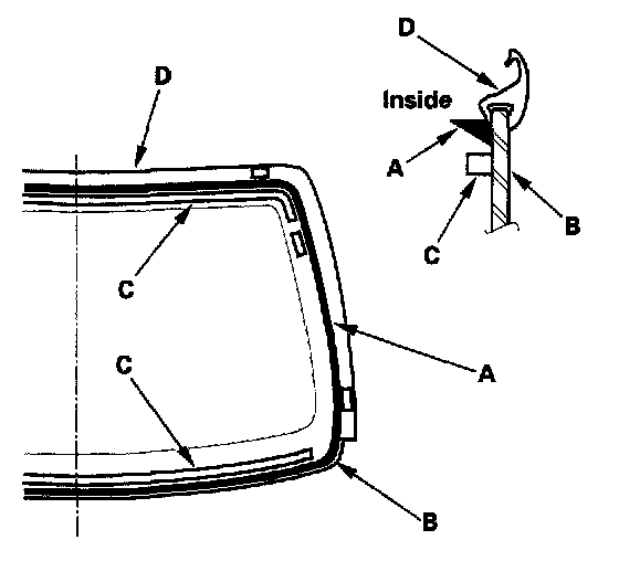 20. Put the cartridge in a caulking gun, and run a bead of adhesive (A) around the edge of the glass (B) between the rubber dam (C) and molding (D) as shown. Apply the adhesive within 30 minutes after applying the glass primer. Make a slightly thicker bead at each corner.