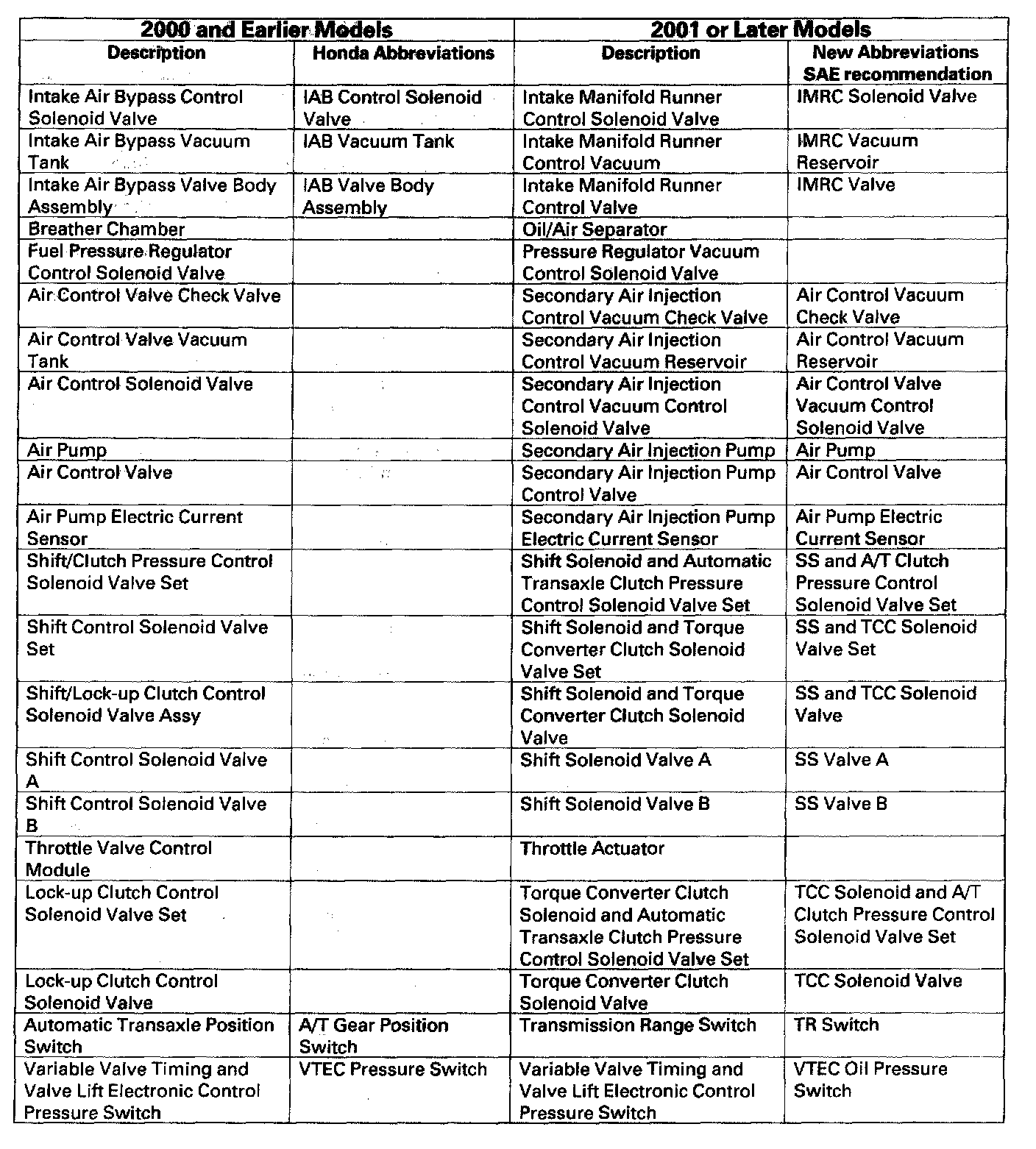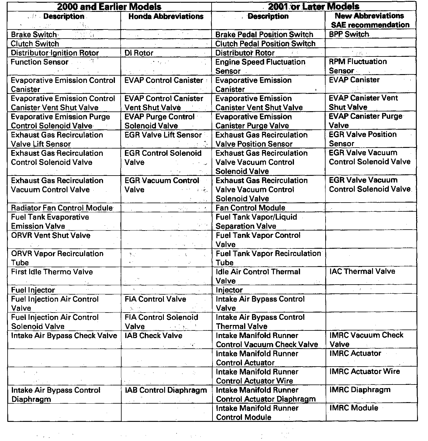 Beginning with 2001 models, the above component terms have been changed to conform with standards in SAE document J1930. If you find a term or abbreviation in a 2001 or later that is unfamiliar to you., check this list. If a term is not listed above, it did not change.