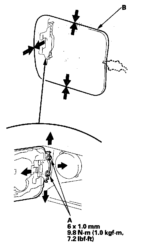2. Adjust the fuel fill door (B) in or out until it's flush with the body, and up or down as necessary to equalize the gaps.