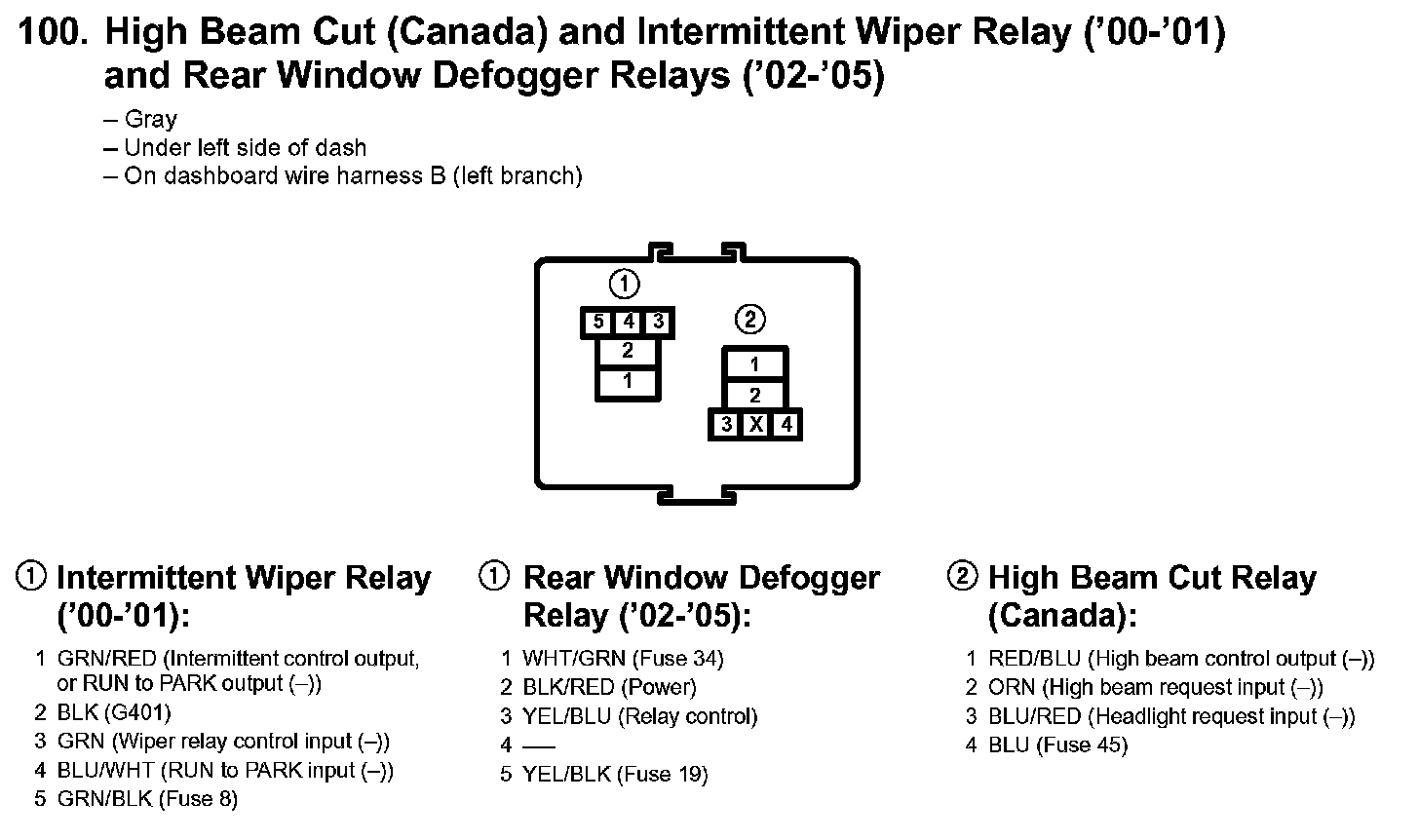 100. High Beam Cut (Canada) And Intermittent Wiper Relay ('00-'01) And Rear Window Defogger Relays ('02-'05):