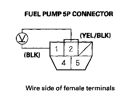 5. Measure voltage between fuel pump 5P connector terminals No. 1 and No. 2 with the ignition switch ON (II). There should be about 5 to 8 V.