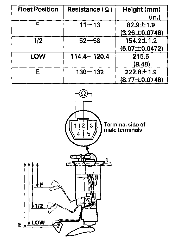 8. Measure the resistance between the No. 1 and No. 2 terminals with the float at E (EMPTY), LOW (LOW FUEL INDICATOR LIGHT IS ON), 1/2 (HALF FULL) and F (FULL) positions. If you do not get the above readings, replace the fuel gauge sending unit.
