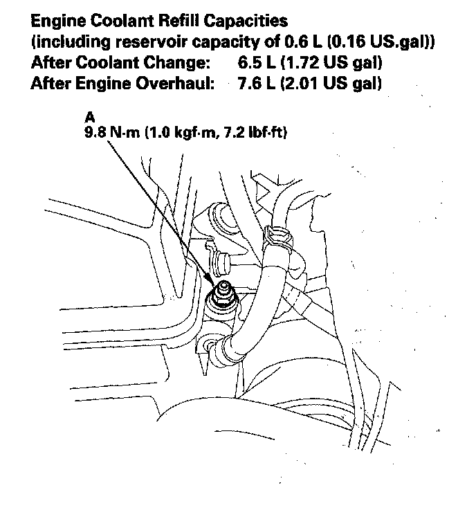 9. Loosen the air bleed bolt (A) in the intake manifold, then pour Honda All Season Antifreeze/Coolant Type 2 into the radiator to the bottom of the filler neck. Do not let coolant spill on any electrical parts or the paint. If any coolant spills, rinse it off immediately.
