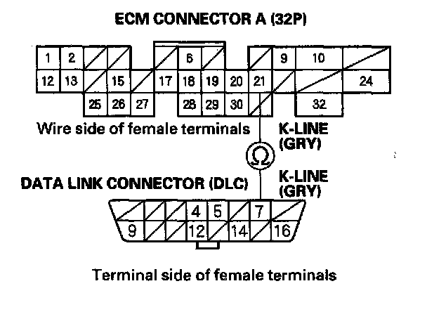 NO - Repair open in the wire between DLC terminal No. 7 and the ECM (A21). After repairing the wire, check for DTCs with a scan tool or the HDS, and go to the indicated DTC's troubleshooting.