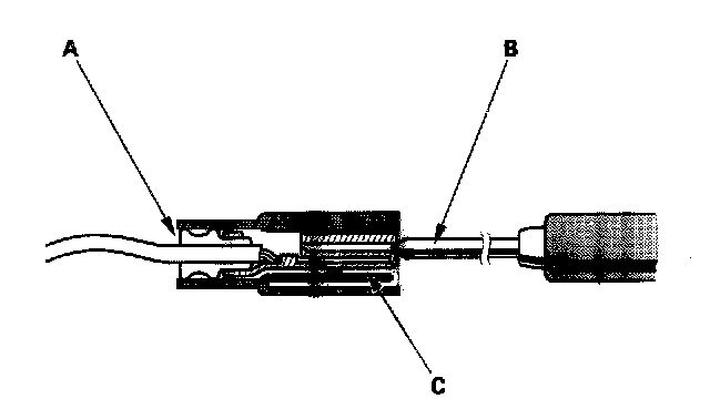 3. If you cannot get to the wire side of the connector or the wire side is sealed (A), disconnect the connector and touch the tester probe (B) to terminals (C) from the terminal side. Do not force the probe into the connector.